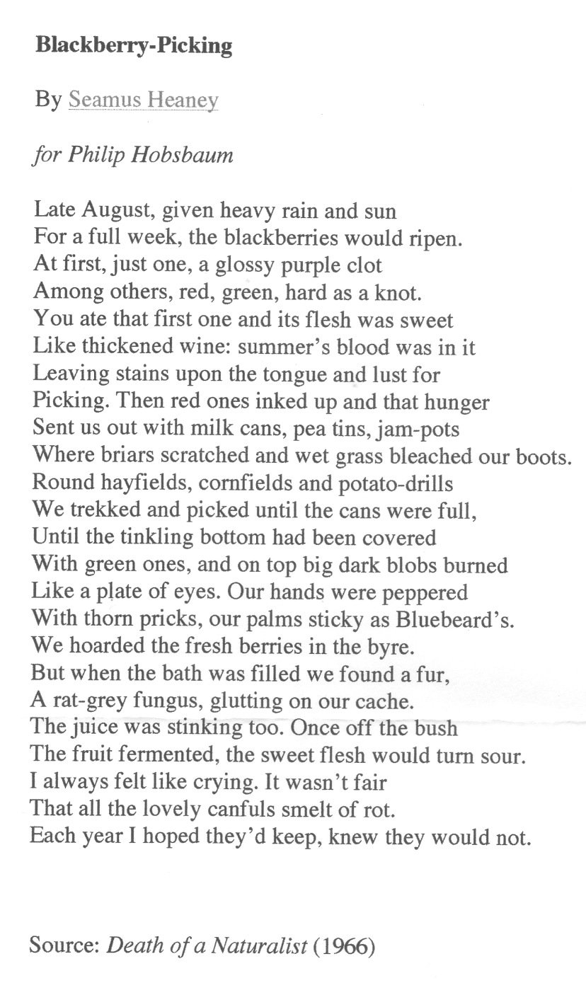 Heaney uses many literary pathways like elocution help develop the poem. Using illuminating word choice and uniformed. In his poems Blackberry-Picking and Digging, blackberry-picking poem essay, Seamus Heaney unveils many events of his childhood along blackberry-picking poem essay his feelings about his past.